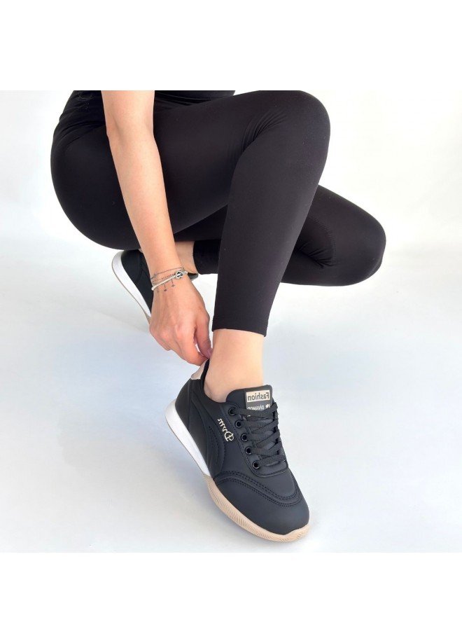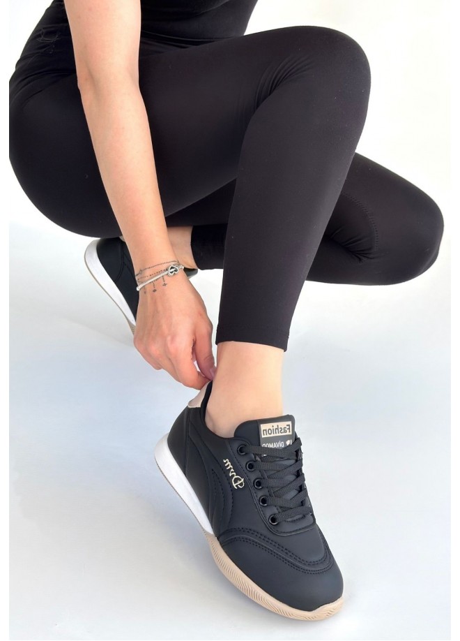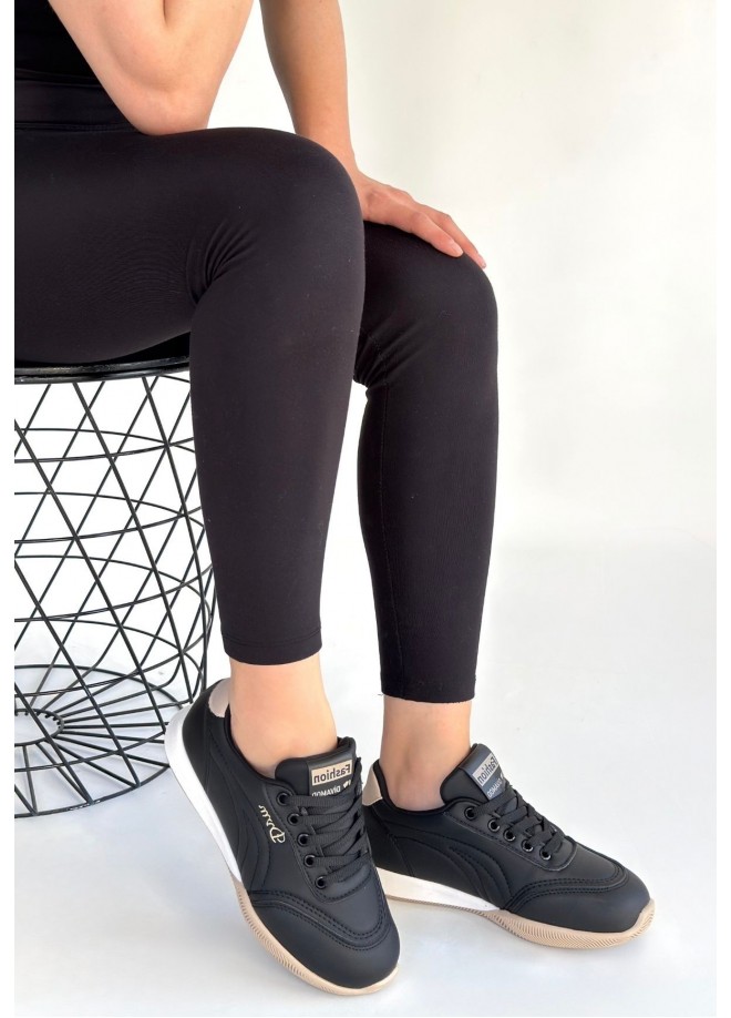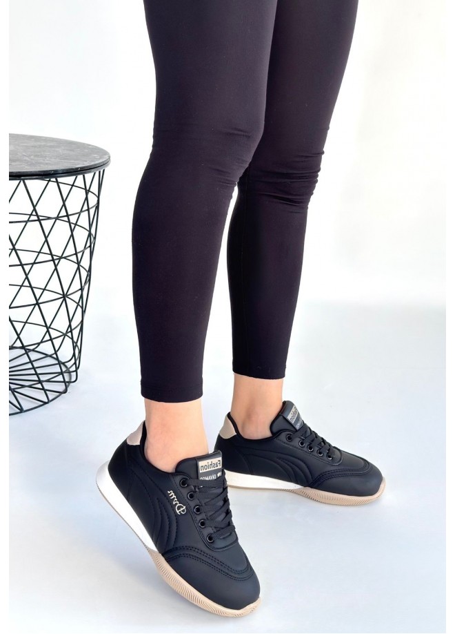 Tawen Siyah Cilt Bej Tabanlı Bağcıklı Spor Ayakkabı