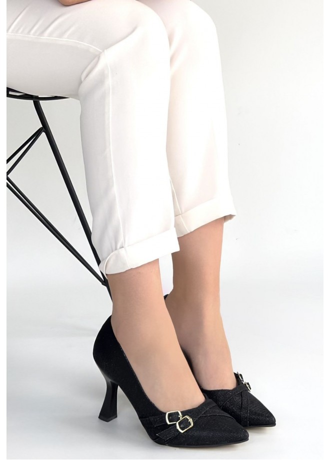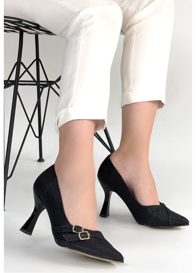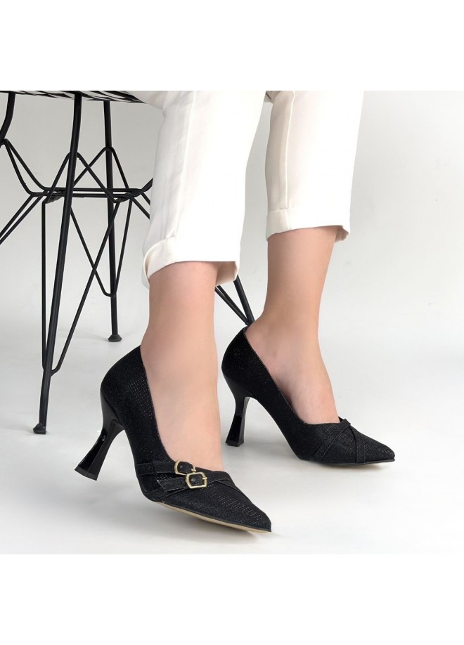Wenda Siyah Simli Cilt Topuklu Ayakkabı
