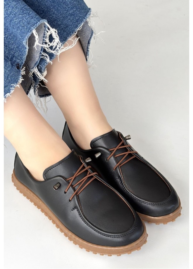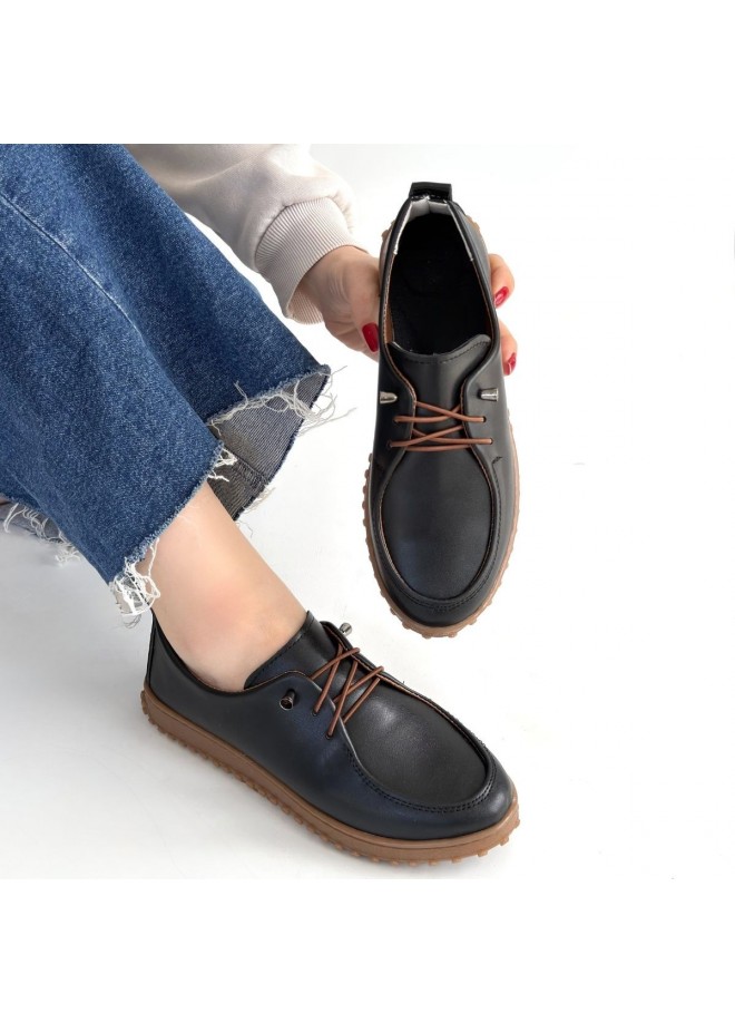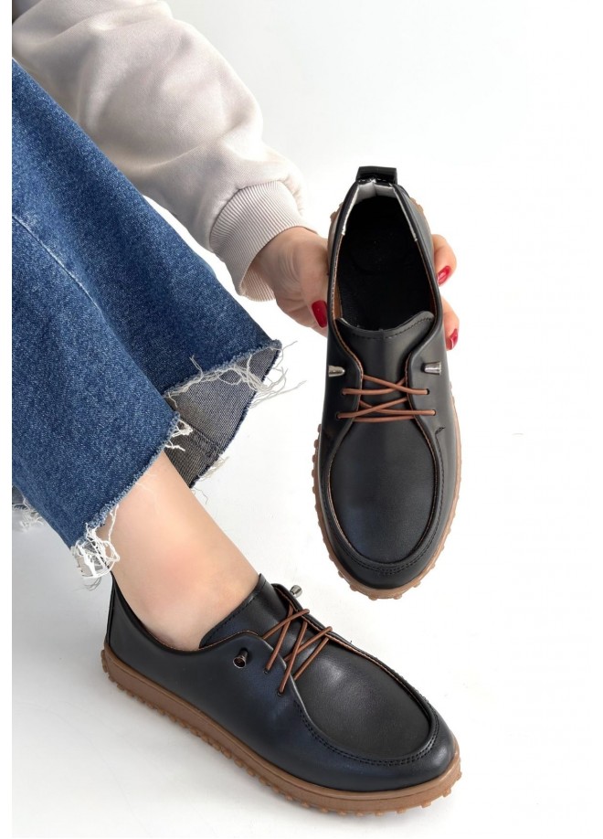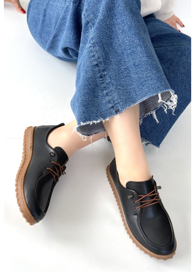 Guot Siyah Cilt Bağcıklı Babet Ayakkabı