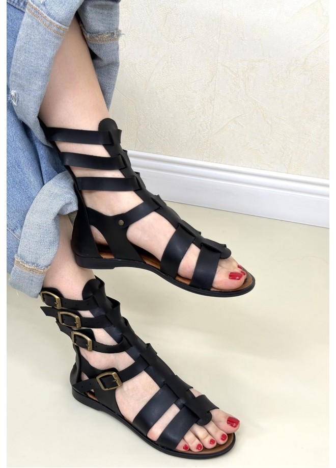 Nola Siyah Deri Kemerli Sandalet