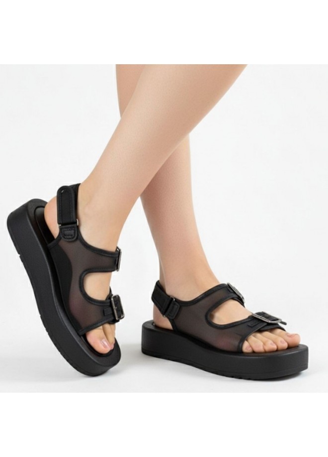 Sinna Siyah Cilt Tül Detaylı Sandalet