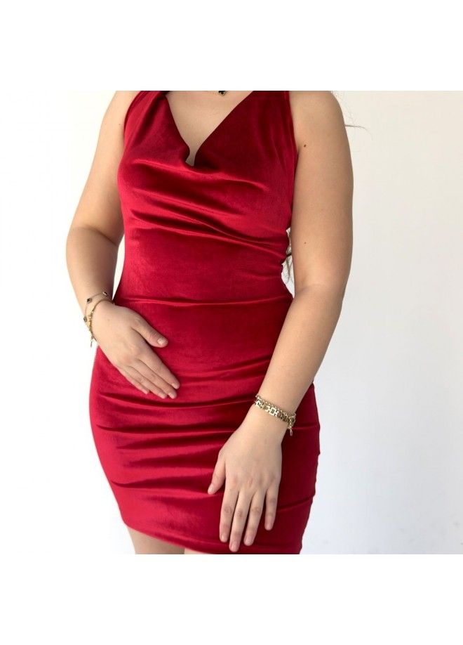 Voter Kırmızı Boyundan Bağlamalı Kadife Elbise